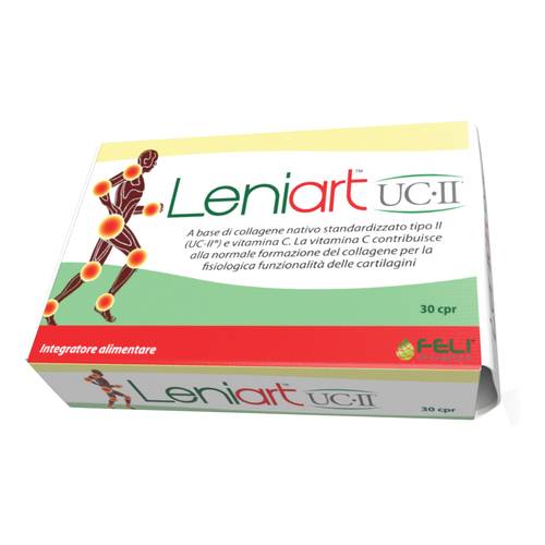 Leniart UC•II Integratore alimentare utile nel mantenimento del trofismo di cartilagine e articolazioni. Il prodotto contiene collagene di ultima generazione, altamente concentrato, ossia un collagene di tipo II nativo (non denaturato) particolarmente biodisponibile. Una dose giornaliera di Leniart UC•II (40 mg di UC•II) preserva la funzionalità articolare, facilita il movimento, migliora la flessibilità e può permettere un allenamento più lungo e costante ritardando la comparsa di disturbi articolari. Ingredienti Collagene di tipo II nativo (non denaturato). Modalità d'uso Assumere una compressa al giorno, lonta...